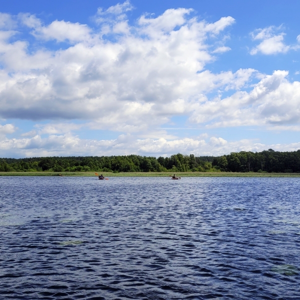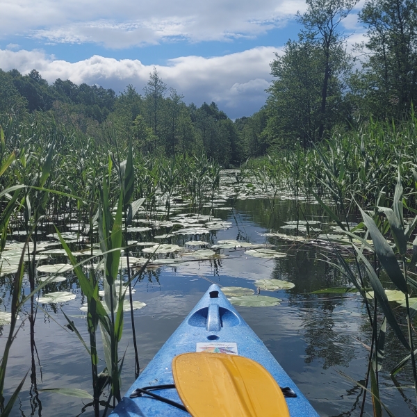 W sobotę o 6:45 rano wyruszymy autokarem z Warszawy na północ kraju. Po drodze czeka nas przerwa śniadaniowa, a spływ rozpoczniemy około godziny 11:00. Kajakową przygodę rozpoczniemy w miejscowości Brzeźno Łyńskie. To stąd wyruszymy wyruszymy właśnie w kierunku źródeł rzeki Łyny. Będziemy płynąć pod prąd w stronę źródeł, ale nurt jest na tyle słaby, że pozwala bez wysiłku eksplorować górny odcinek rzeki. Po drodze miniemy małe jeziora: Morze, Brzeźno Duże, Brzeźno Małe i Krzyż, otoczone dziką roślinnością i siedliskami bobrów. Po eksploracji źródeł rzeki wrócimy z prądem rzeki do Brzeźna. W trzcinach na północno‑zachodnim brzegu znajduje się ukryty wypływ Łyny prowadzący na jezioro Kiernoz Mały – niewielkie, spokojne i otoczone lasem. Po krótkim przesmyku wpłyniemy na jezioro Kiernoz Wielki – znacznie większe jezioro, z charakterystyczną wyspą na środku. W tym miejscu otwiera się szerzej panorama, a w oddali widać już miejscowość Kurki oraz malownicze jeziora Kiernoz Mały i Kiernoz Wielki, których spokojna tafla wody, otoczona gęstymi lasami, wprowadzi nas w prawdziwy, sielski nastrój. Za wyspą na jeziorze Kiernoz Wielki ponownie odnajdziemy wypływ Łyny i przepłyniemy pod drewnianym mostkiem. Od tego miejsca rzeka płynie łagodnie wśród łąk i lasów. Po kilku kilometrach spokojnego odcinka dopłyniemy do Jeziora Łańskiego – jednego z największych i najczystszych jezior regionu, otoczonego gęstymi lasami. Przez wiele lat było zamknięte dla ruchu turystycznego, co sprawiło, że zachowało wyjątkowo dziki charakter. Spływ zakończymy na północnym brzegu jeziora, w pięknej scenerii Warmii, w okolicy miejscowości Rybaczówka. Chwile potem pojedziemy do miejsca noclegu, gdzie czekać na nas będzie obiadokolacja. Dzień zakończymy przy ognisku, gdzie zrelaksujemy się i spędzimy czas w gronie nowych przyjaciół, ciesząc się wspólną integracją 🙂
